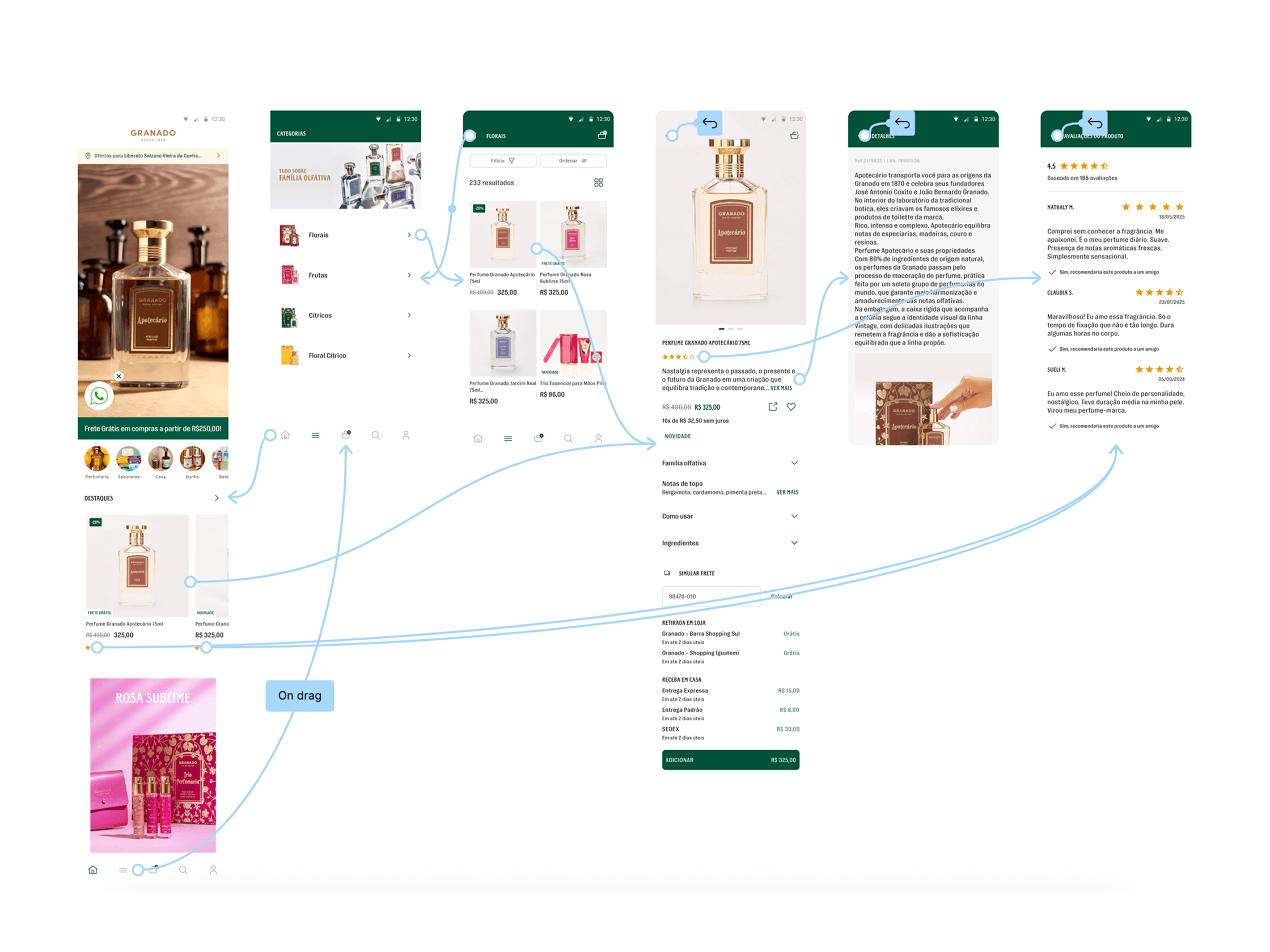 The app extends Granado’s e-commerce into a dedicated mobile experience, allowing users to browse products, navigate categories, and complete purchases through a structure adapted from the existing online store. Developed collaboratively by the design team, the experience builds on a familiar commerce foundation while introducing adjustments that better support mobile interactions.